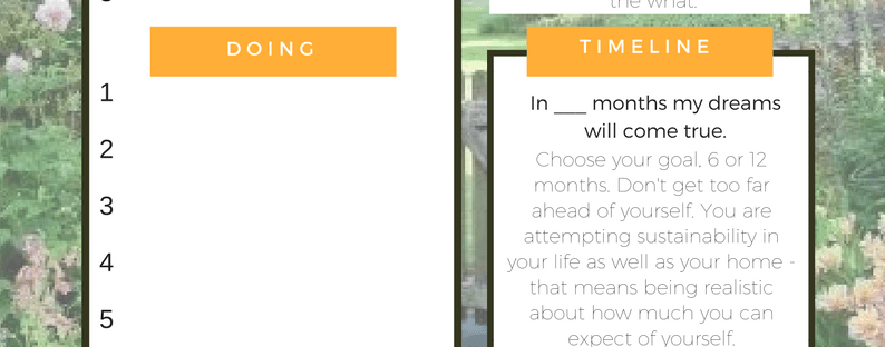 - Outline your goals. Let’s identify exactly what you want to have, who you want to be, and what you want to do. I’m applying these to homesteading and sustainability. Try to list 3-5 ideas for each category. Then – Pick 3. Not 3 of each category, just your 3 most important ones. What ideas if you make them reality will make the biggest difference in your life in 3 months?