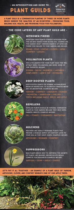 The next aspect of growing according to permaculture involves pairing plants to form guilds. If you’re familiar with companion planting you’ll know that some plants work well with others. Think the “three sisters” of squash, beans, and corn. Each plant gives and receives something from its companions, forming a web of interdependence. When piecing together your own guilds it’s important to take into account what plants do- for each other, and for the soil.